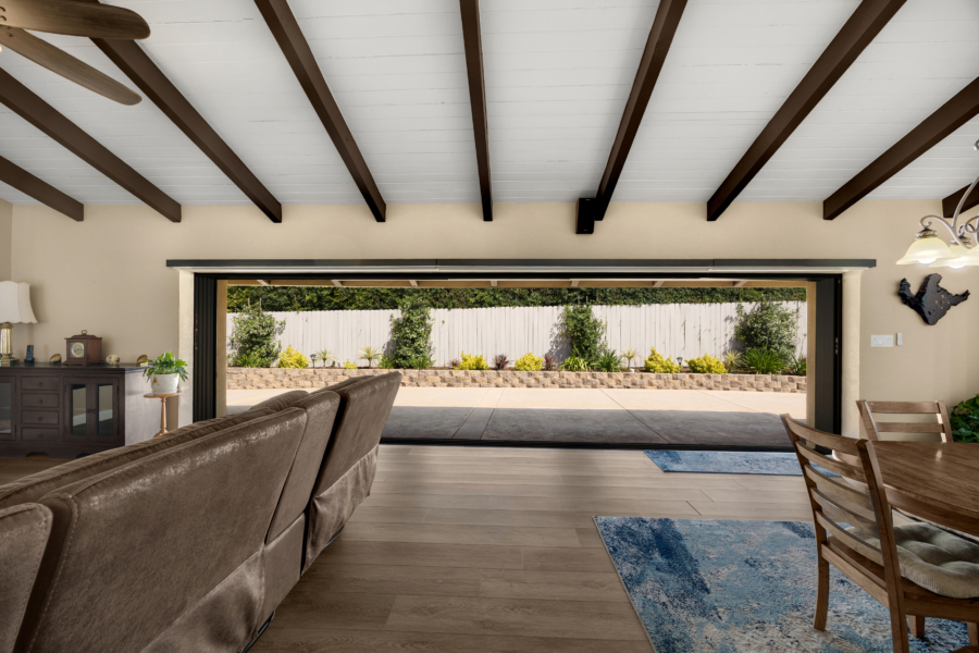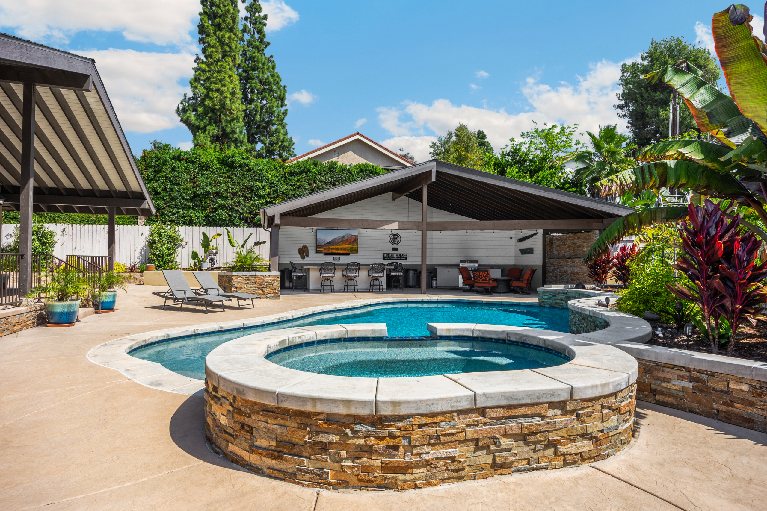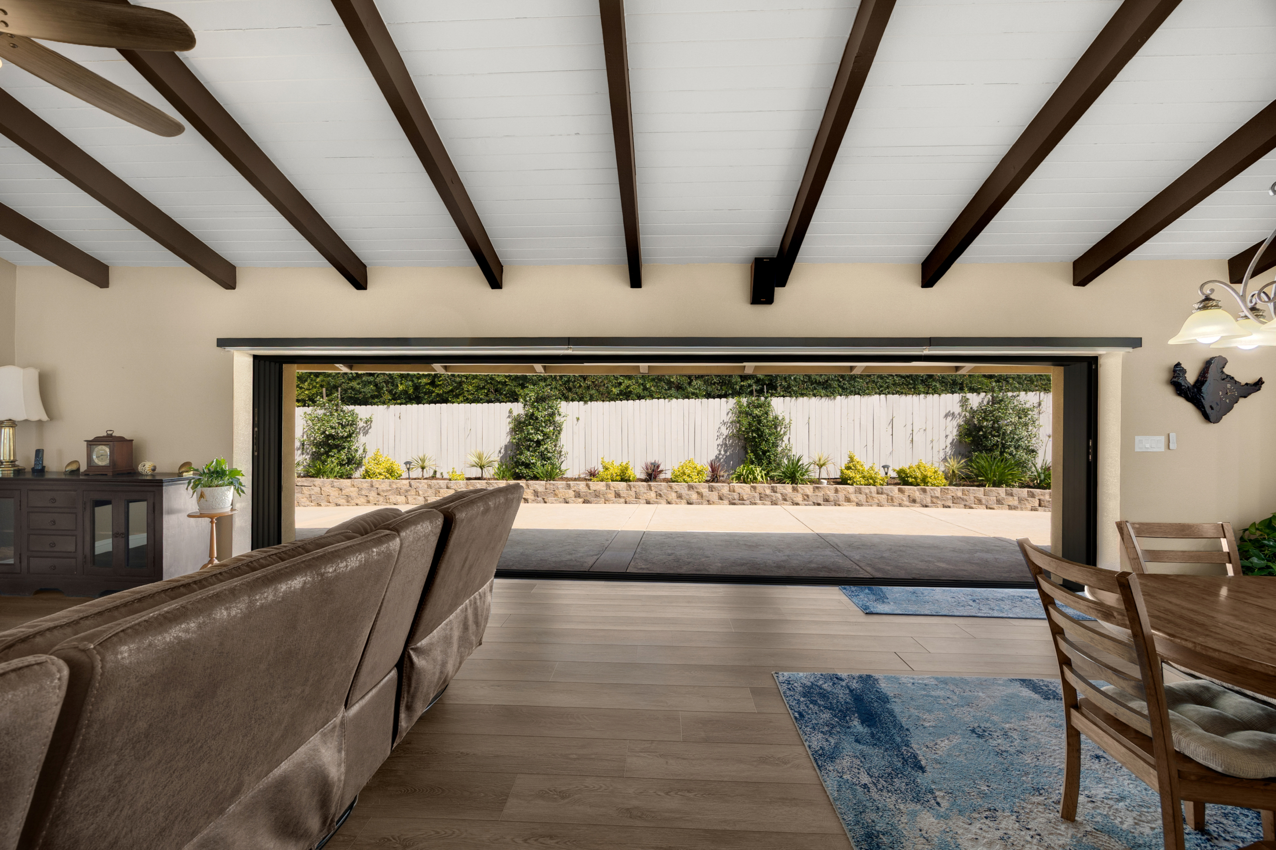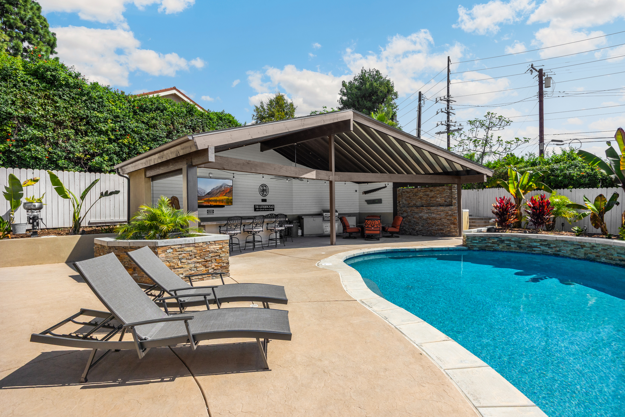 Tucked at the end of a quiet Brea cul‑de‑sac, this GORGEOUS custom single‑story residence offers 5 bedrooms, 4 bathrooms, 3,274 sq ft, and an attached four‑car garage. Completely reimagined in 2023—torn down to two walls and expanded by roughly 1,500 sq ft—it blends modern comfort with thoughtful design. Double doors open to an inviting entry, with a convenient three‑quarter bathroom immediately to the right. From here, you step into the living room, where a vaulted ceiling with exposed beams frames a dramatic 25‑ft LaCantina five‑panel multi‑slide door that disappears into the wall, creating seamless indoor‑outdoor living. Motorized shades add ease and ambiance. The dining area enjoys the view to the back patio and sits between the living room and kitchen, keeping gatherings connected. The kitchen features Brazilian granite counters, custom cabinetry, a large island, and Viking appliances including a drink fridge and double oven. The primary suite feels like a retreat, offering its own 15‑ft three‑panel multi‑slide door, a stunning bathroom with a soaking tub, a huge shower with three shower heads, and an oversized walk‑in closet with built‑in organizers. Down the hall are three guest bedrooms, a full bathroom, and a laundry room with a sink and cabinetry. The mother‑in‑law suite provides exceptional flexibility with its separate entrance, generous layout, handicap accessibility, and private bathroom. The backyard is built for year‑round enjoyment with a PebbleTec saltwater pool and spa, a 40‑ft by 18‑ft peaked patio cover, and an outdoor kitchen featuring a custom 12‑ft bar, built‑in BBQ, and an 85″ Samsung TV with sound bar. Additional highlights include RV parking, a built‑in speaker system throughout the home and yard, a 4‑zone dual HVAC system, underground utilities, an exterior drainage system, and vaulted ceilings in all living areas and bedrooms. Nearby are award‑winning schools, great restaurants, and abundant shopping options. Don’t miss this one!