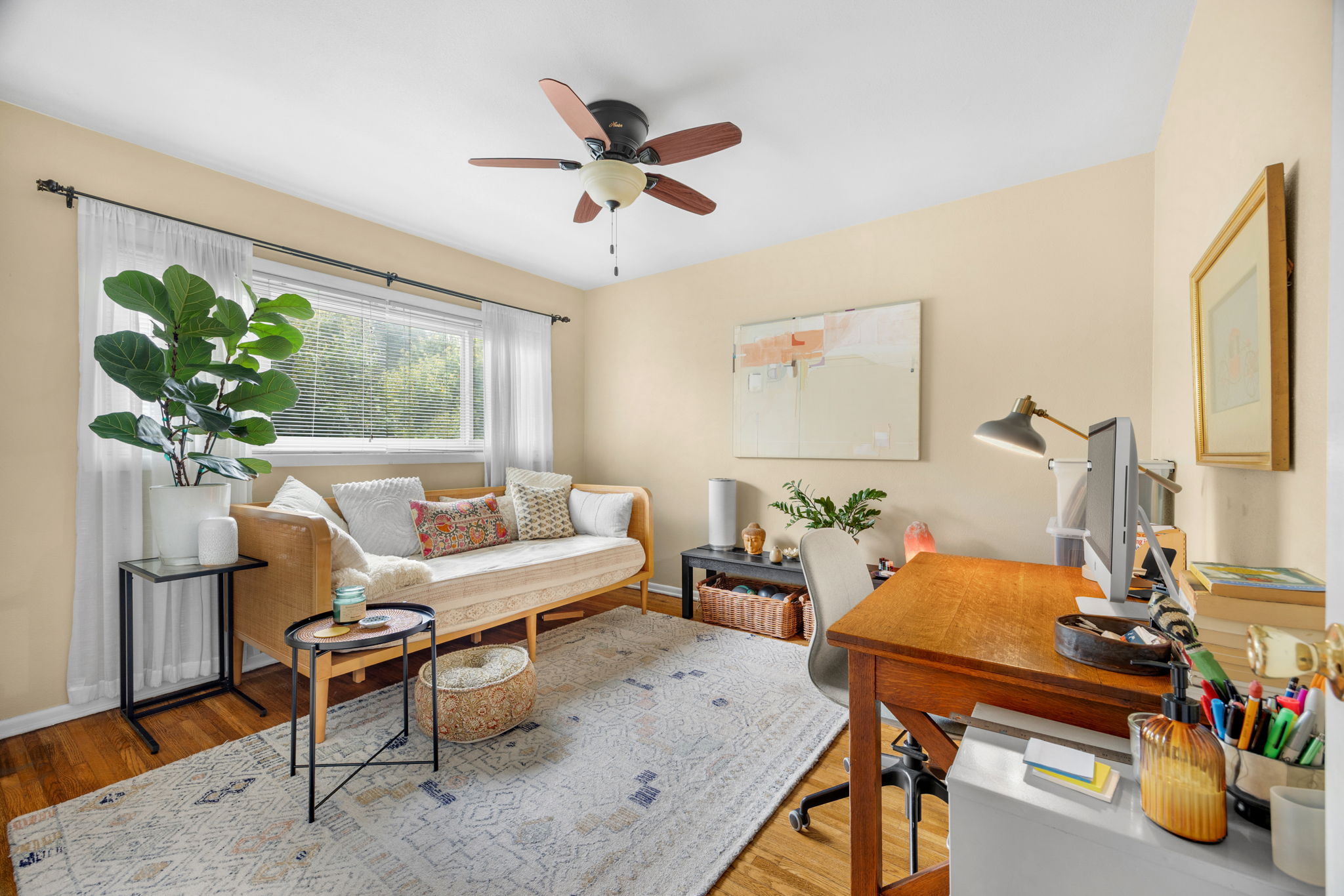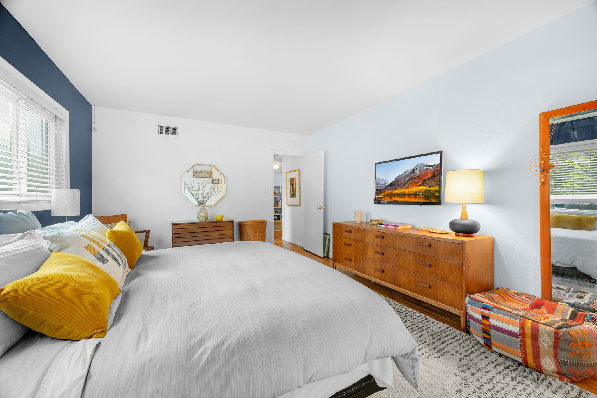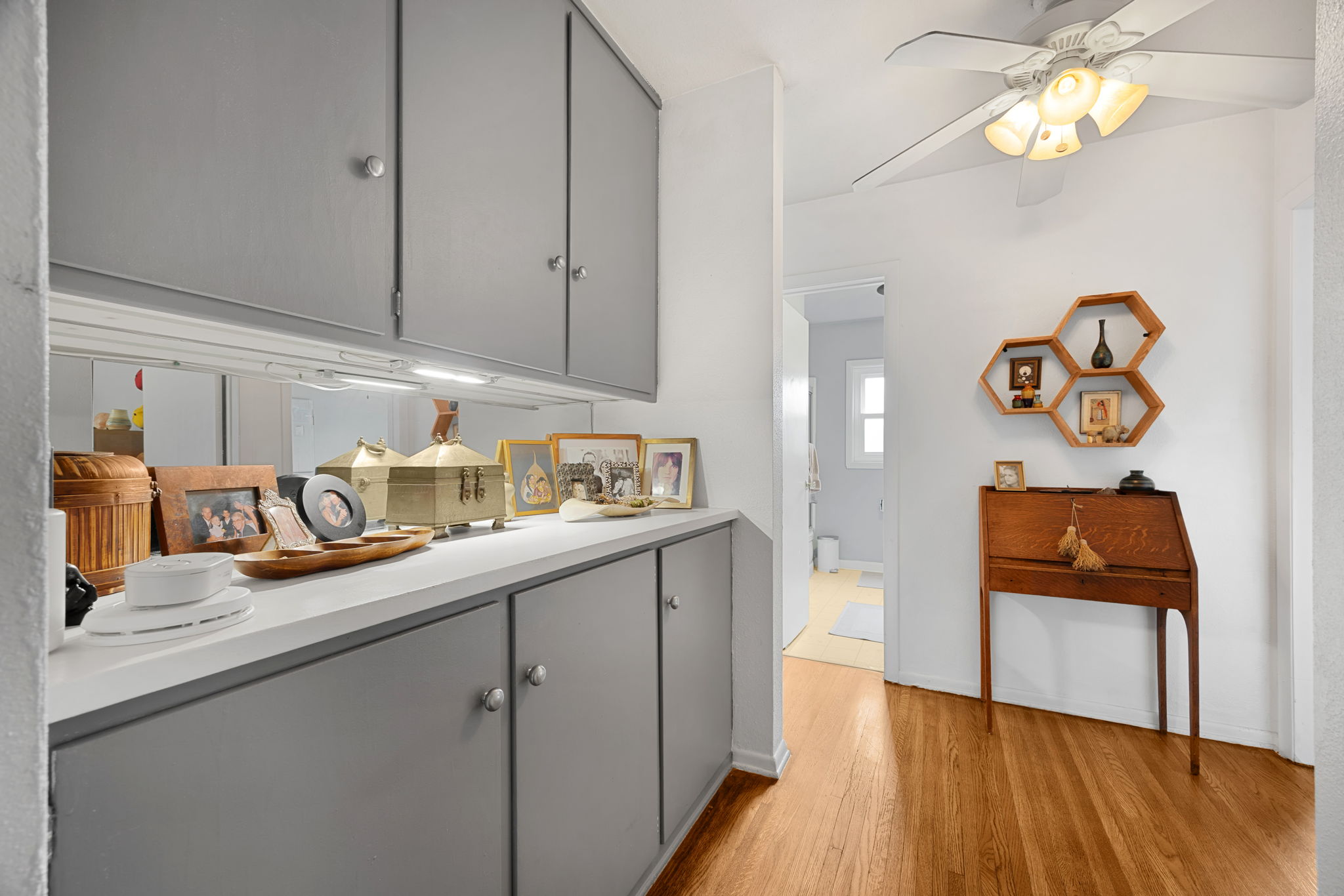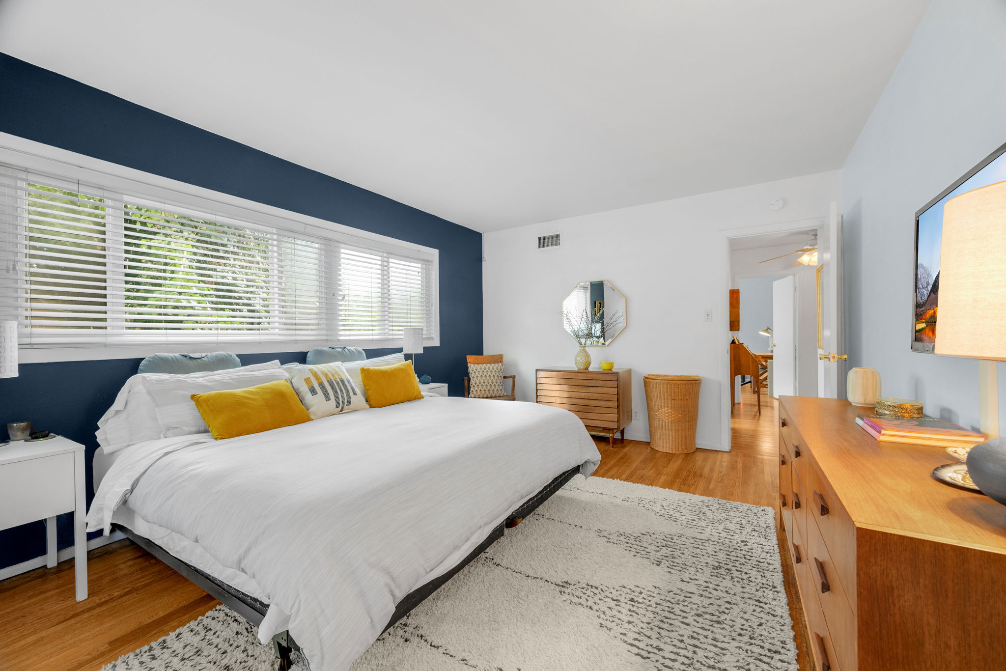 Nestled on a peaceful cul-de-sac in Valley Village, this charming single-level home offers 3 bedrooms, 2 bathrooms, and 1,727 sq ft of comfortable living space. Built in 1958, it features an attached two-car garage and a layout designed for ease and flow. Step through the front door and into the inviting living room, where rich wood flooring stretches across much of the home, setting a warm and cohesive tone. Just beyond, the formal dining area awaits—anchored by a cozy fireplace and illuminated by natural light pouring through a glass sliding door that opens to the backyard. The kitchen, conveniently located adjacent to the dining area, is equipped with ample cabinetry and a double oven, perfect for culinary enthusiasts. A quaint dinette area sits nearby, offering a lovely view of the front yard and a relaxed spot for morning coffee. Tucked between the kitchen and dinette is a discreet laundry closet, adding everyday practicality. Down the hall, two guest bedrooms provide restful retreats, each outfitted with ceiling fans for added comfort. A full guest bathroom serves these rooms, offering functionality and style. The primary bedroom suite is generously sized, featuring a walk-in closet and its own en-suite 3/4 bathroom with a shower, creating a private haven within the home. Step outside to discover a tranquil backyard framed by lush landscaping that enhances privacy. A covered patio invites outdoor dining, lounging, or entertaining in a serene setting. Located near award-winning schools, popular restaurants, and abundant shopping options, this home combines quiet residential living with convenient access to everything Valley Village has to offer.